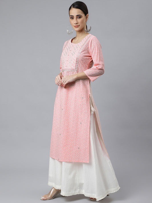 Pink Women Bandhani Straight Kurta