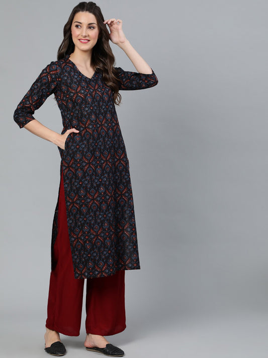 Navy Blue and Maroon Women Floral Print Straight Kurta